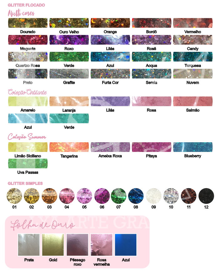 Ex.: glitter flocado do "multi cores" - rosê; folha de ouro "gold"; glitter flocado lilás da "coleção cintilante" (até porque essa cor também consta em "Multi cores").