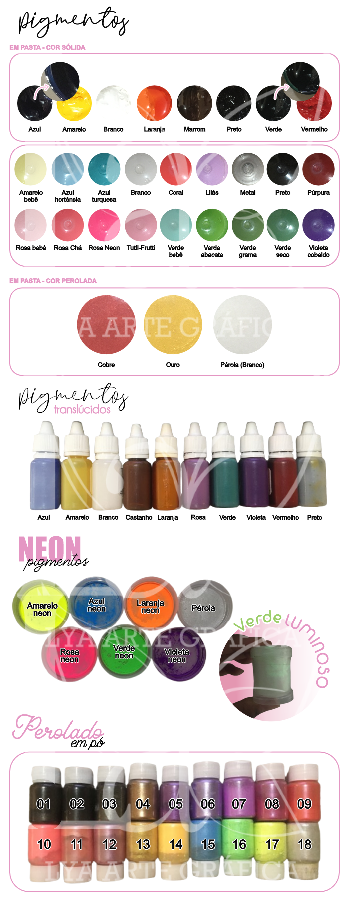 Ex.: pigmento "em pasta cor sólida" - rosa; "em pasta cor perolada" - pérola; "perolado em pó" número 12.